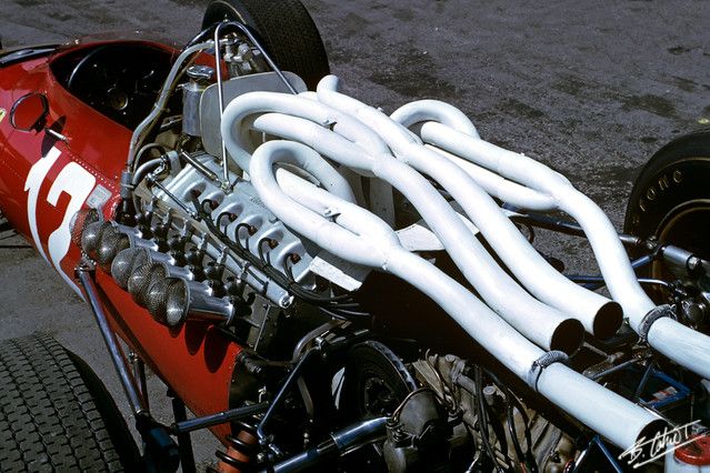 Motor Ferrari de los años 60, con múltiples tubos de escape visibles, diseño de V12/V10. -